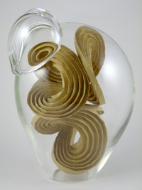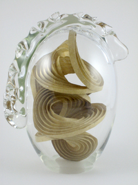 We have worked together for several years in both glass sculpture and paper sculpture, and have longed to create sculpture from both media in a way that they relate to one another—that they communicate. To start with, we as artists must communicate with the material. Paper relies on touch. The tactile interaction lets you talk to the paper, asking it to bend, and you can hear the material responding, as the folds form the shape.