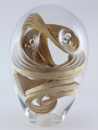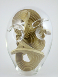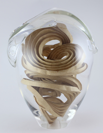 The communication between paper and glass continues through the curved-crease sculptures placed inside the glass forms. We use computers to design these sculptures, based on algorithms from the field of computational origami. Here we fold paper along concentric circular creases, a design originating at the Bauhaus in the late 1920s. Creases set the memory of the paper so that it tries to return to a specific dihedral angle, while uncreased paper tries to remain flat. Confined to open within a glass enclosure, the paper finds new equilibrium forms, which would not exist without the communication between the materials. We chose a head shape for the glass to hold the paper, as it embodies most forms of human communication: vision, voice, hearing, and smell.
