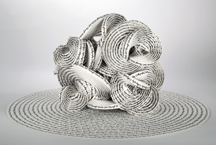 The second folded-paper sculpture is in English, with each circle alternating between “Calligraphy” and “Art Through Words”.