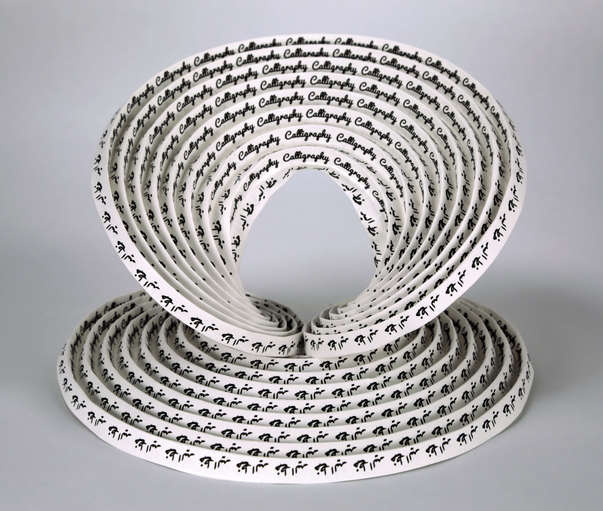 Each three-dimensional dot is manipulated into different forms to form the folded-paper sculptures. For example, the following form shows a transition from the English rings being visible to the Arabic rings being visible.