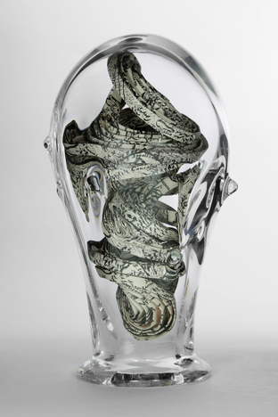 [H0281] “Transparent Moon” (2014), joint work with Michael Benson, elephant hide paper and hand-blown glass, 6" × 6" × 11" high: