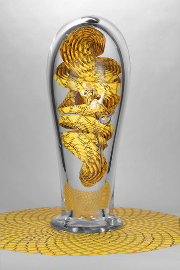 [H0381] “Glass Sunflower” (2017), Mi-Teintes watercolor paper and hand-blown glass, 5" × 5" × 13" high: