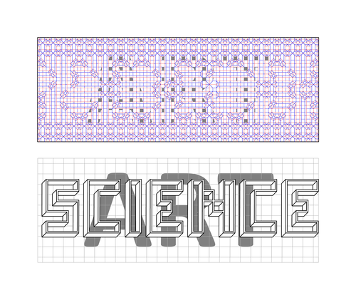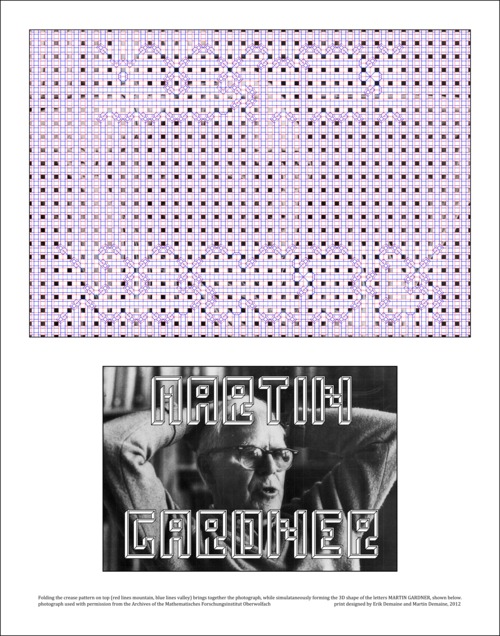 These limited-edition prints explore the concept of communicating words through folded shape, often juxtaposed with inked words. The prints show a complicated crease pattern, generated by a computational origami algorithm, that folds into the 3D shape of letters and other graphics. By itself, the crease pattern is a mysterious puzzle, but folding resolves it to recognizable a pattern. This exploration began with our Yes/No print (2011) in a collaboration with Sarah Stengle. See our more detailed description of that collaboration.