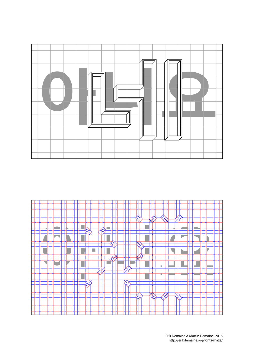 The crease pattern on bottom of this print folds into the 3D structure of 네 (“ne”, formal “yes” in Korean), while the gray inking in the sheet (bottom) comes together to form 아니요 (“aniyo”, formal “no” in Korean) in the background (top).