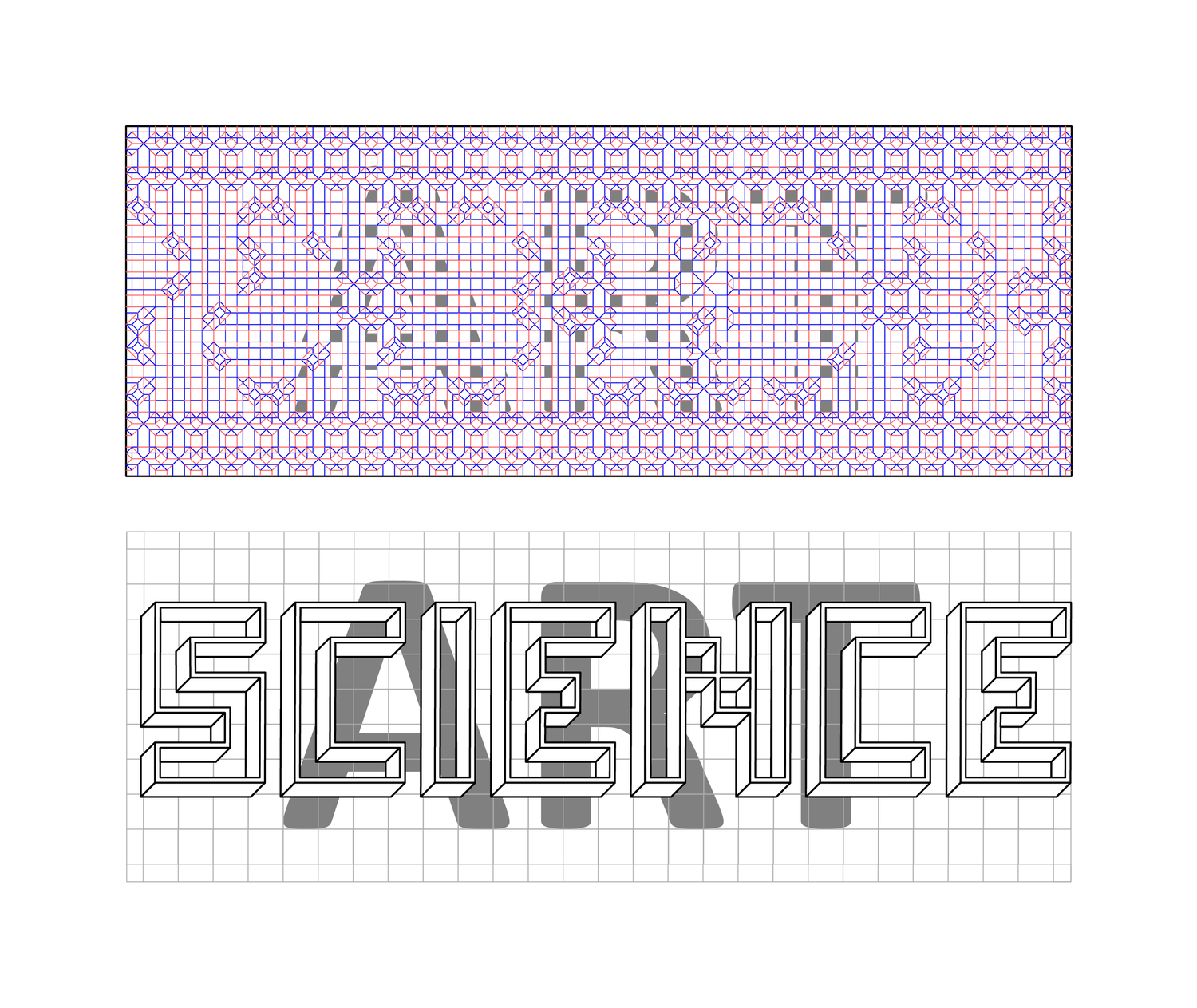 The crease pattern on top of this print folds into both SCIENCE and ART, as shown on the bottom of this print (not to scale). The rectangular paper sheet folds into the 3D structure of the word SCIENCE, while the gray inking in the sheet (top) forms the inked ART in the background (bottom). The message is that science and art can exist on a common plane, as two different perspectives of the same object.